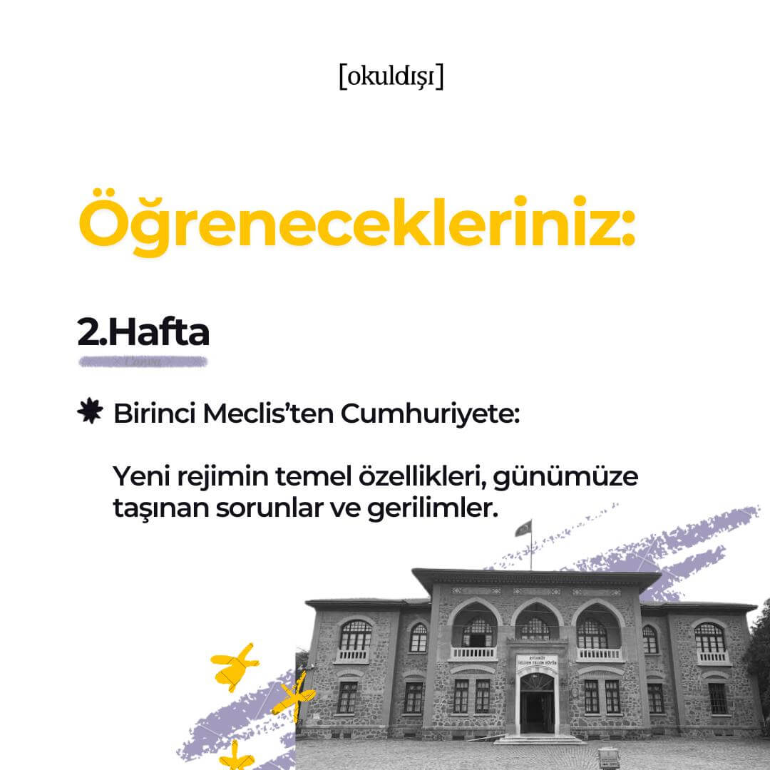 • Birinci Meclis’ten Cumhuriyet’e : Yeni rejimin temel özellikleri, günümüze taşınan sorunlar ve gerilimler.